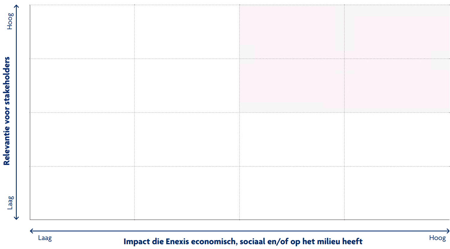 In 2021 is de materialiteitsmatrix herzien in aanloop naar het nieuwe strategisch plan. Uit de analyse kwam een stabiele top 5 aan materiële thema’s, gericht op de kerntaken van Enexis. De top 5 thema’s, die sinds 2018 onveranderd is, is door de raad van bestuur vastgesteld als hoog materieel. Deze thema’s dragen bij aan het bepalen van de focus in corporate planvorming, verslaglegging en communicatie.